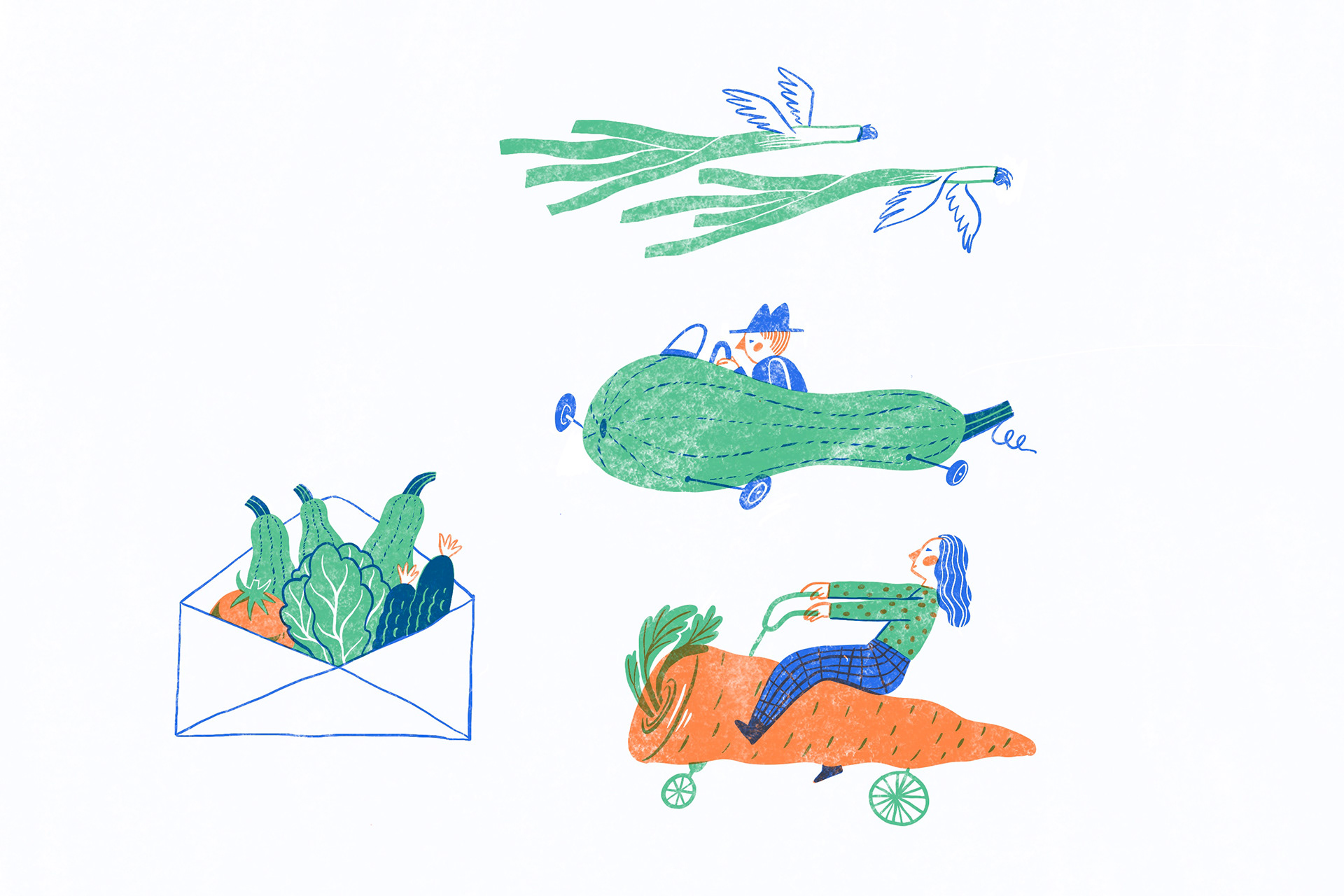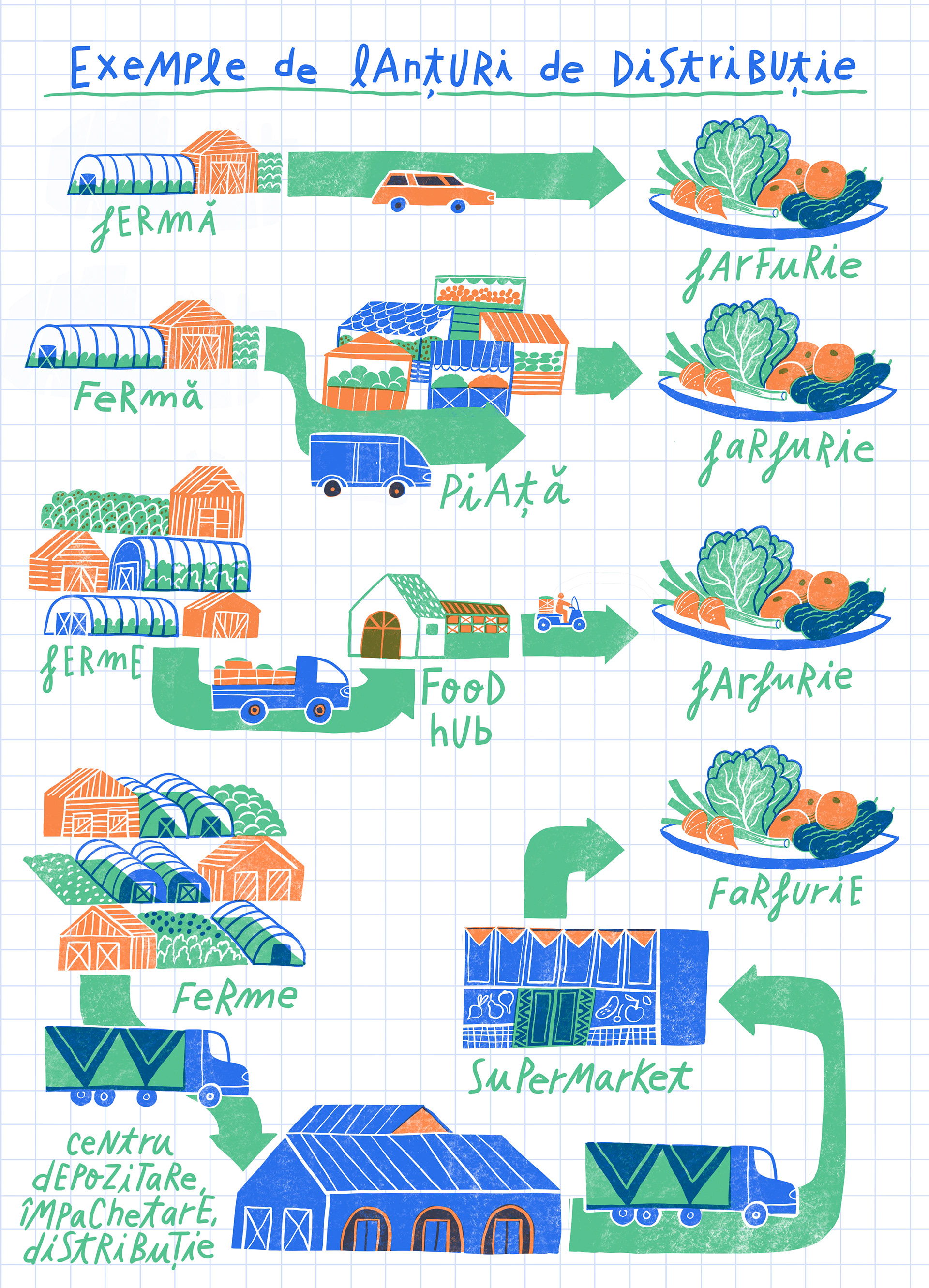 Editorial illustration for Revista DOR - illustrating how food distribution chains changed for little farms during the pandemic lockdown in Romania.